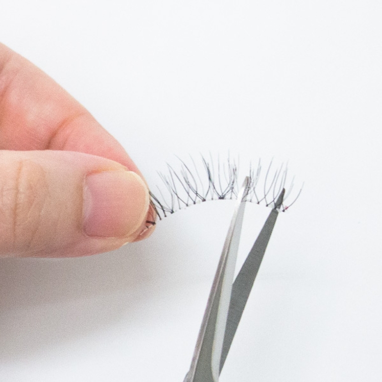 つけまつげを目の幅にあわせます。長い場合はカットし調整します。