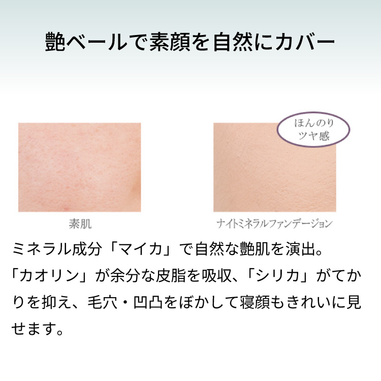 ミネラル成分「マイカ」で自然な艶肌を演出。「カオリン」が余分な皮脂を吸収、「シリカ」がてかりを抑え、毛穴・凹凸をぼかして寝顔もきれいに見せます。
