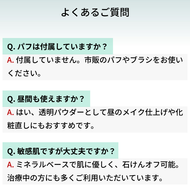 A. はい、透明パウダーとして昼のメイク仕上げや化粧直しにもおすすめです。 - Q. 敏感肌ですが大丈夫ですか?