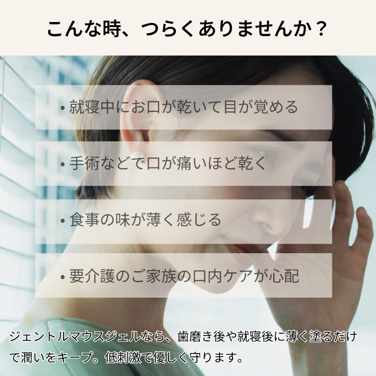 ジェントルマウスジェルなら、歯磨き後や就寝後に薄く塗るだけで潤いをキープ。低刺激で優しく守ります。