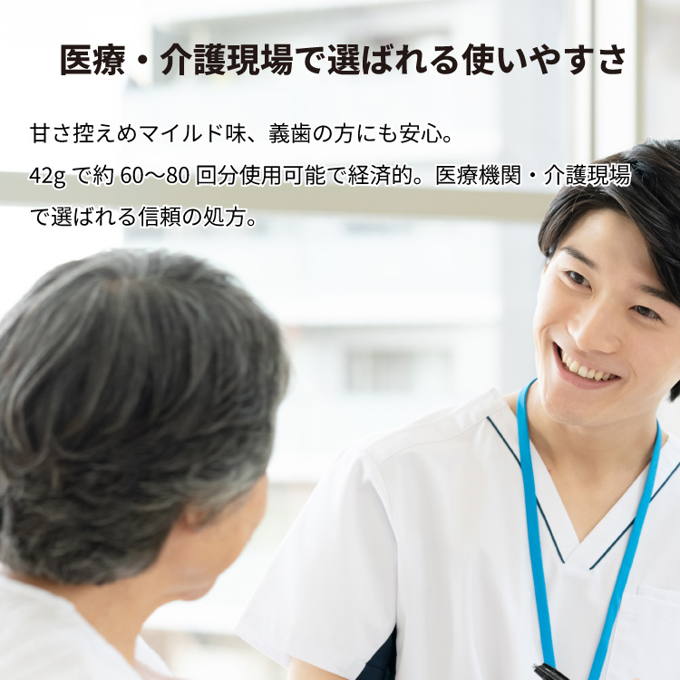 甘さ控えめマイルド味、義歯の方にも安心。42gで約60〜80回分使用可能で経済的。医療機関・介護現場で選ばれる信頼の処方。