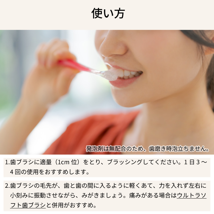 発泡洗浄剤(ラウリル硫酸ナトリウム)無配合の お口にやさしい低刺激性の歯みがき剤です。 毎日の歯みがきタイムで口内環境を整えましょう。