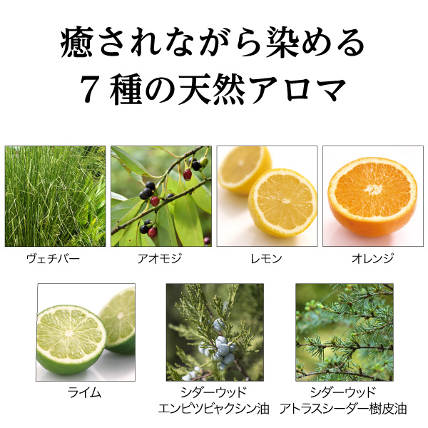 アレルギーや肌あれを引き起こす可能性が高い刺激のある染料や浸透剤を一切使用していません。頭皮や髪に優しく、身体への優しさにも配慮しながら、艶やかな仕上がりに。