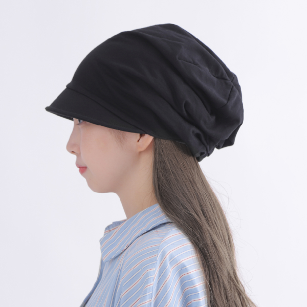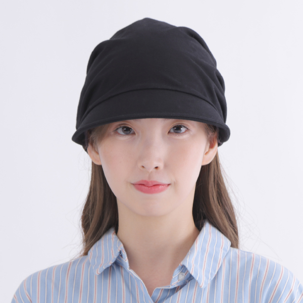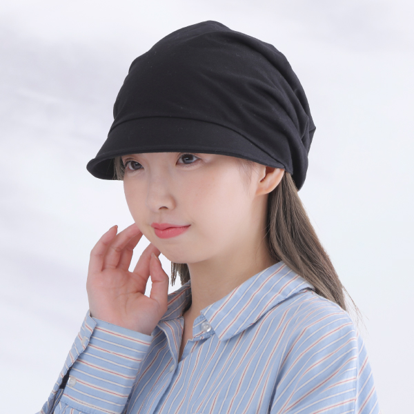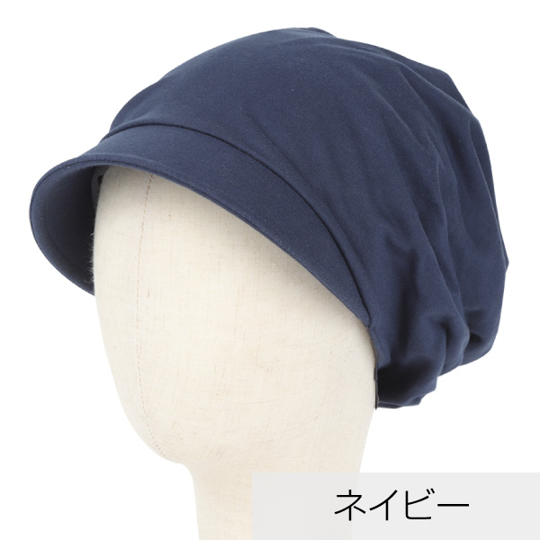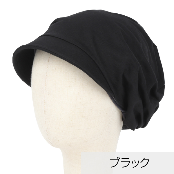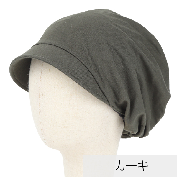 顔周りがすっぽり包み込まれるカットソー生地のキャスケット