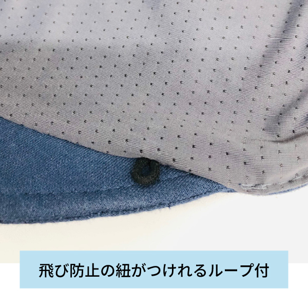 風の強い日でも安心して着用できる【飛び防止】用の紐をつける「ループ」がついています。